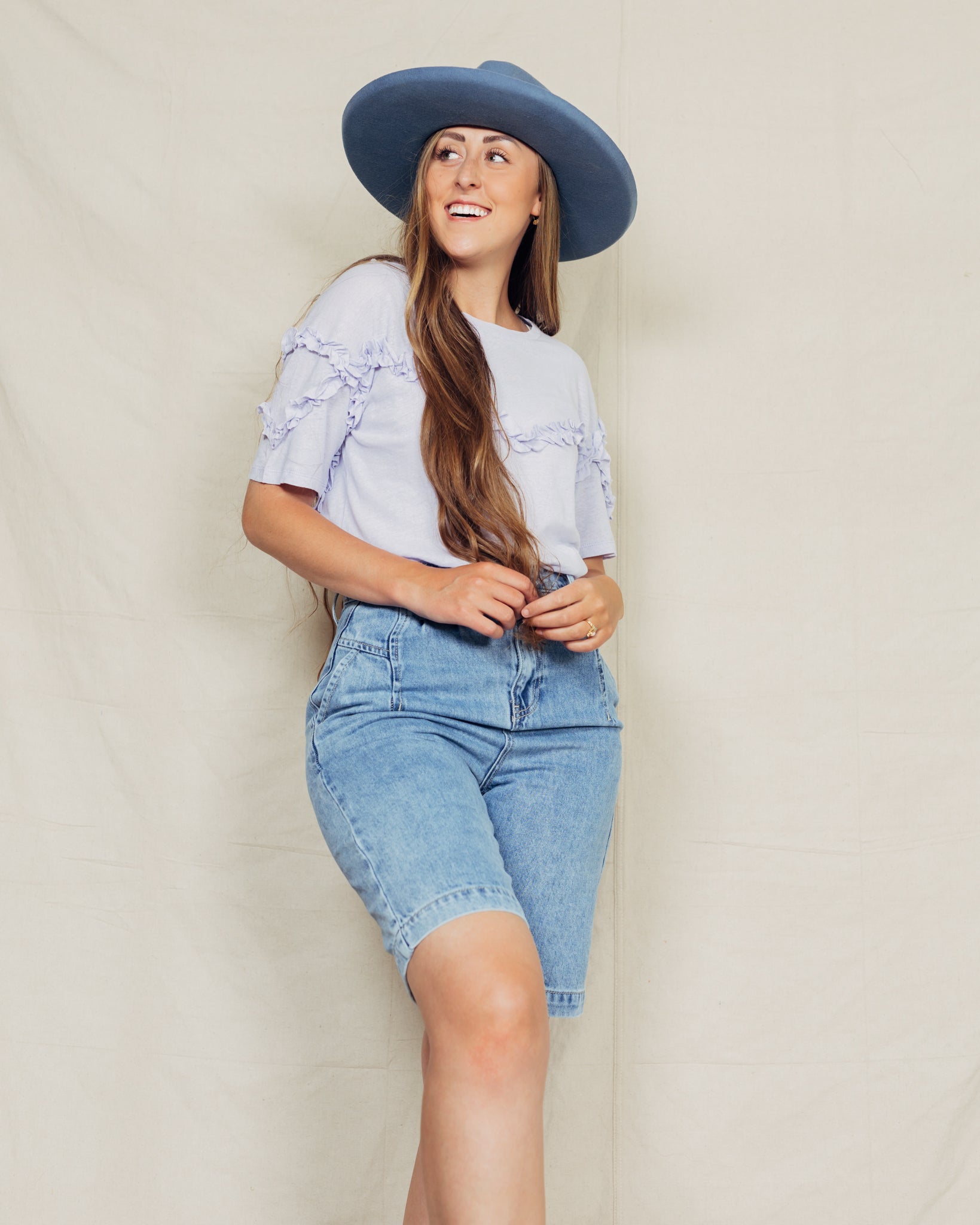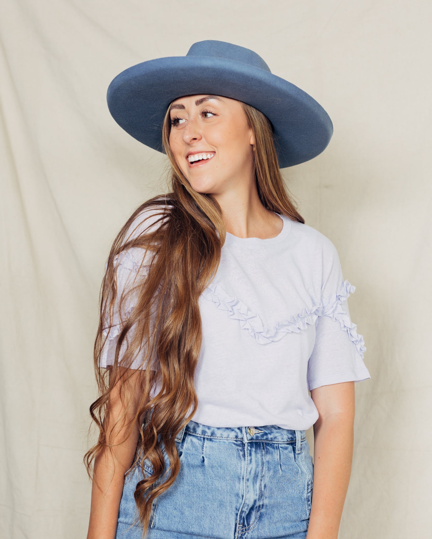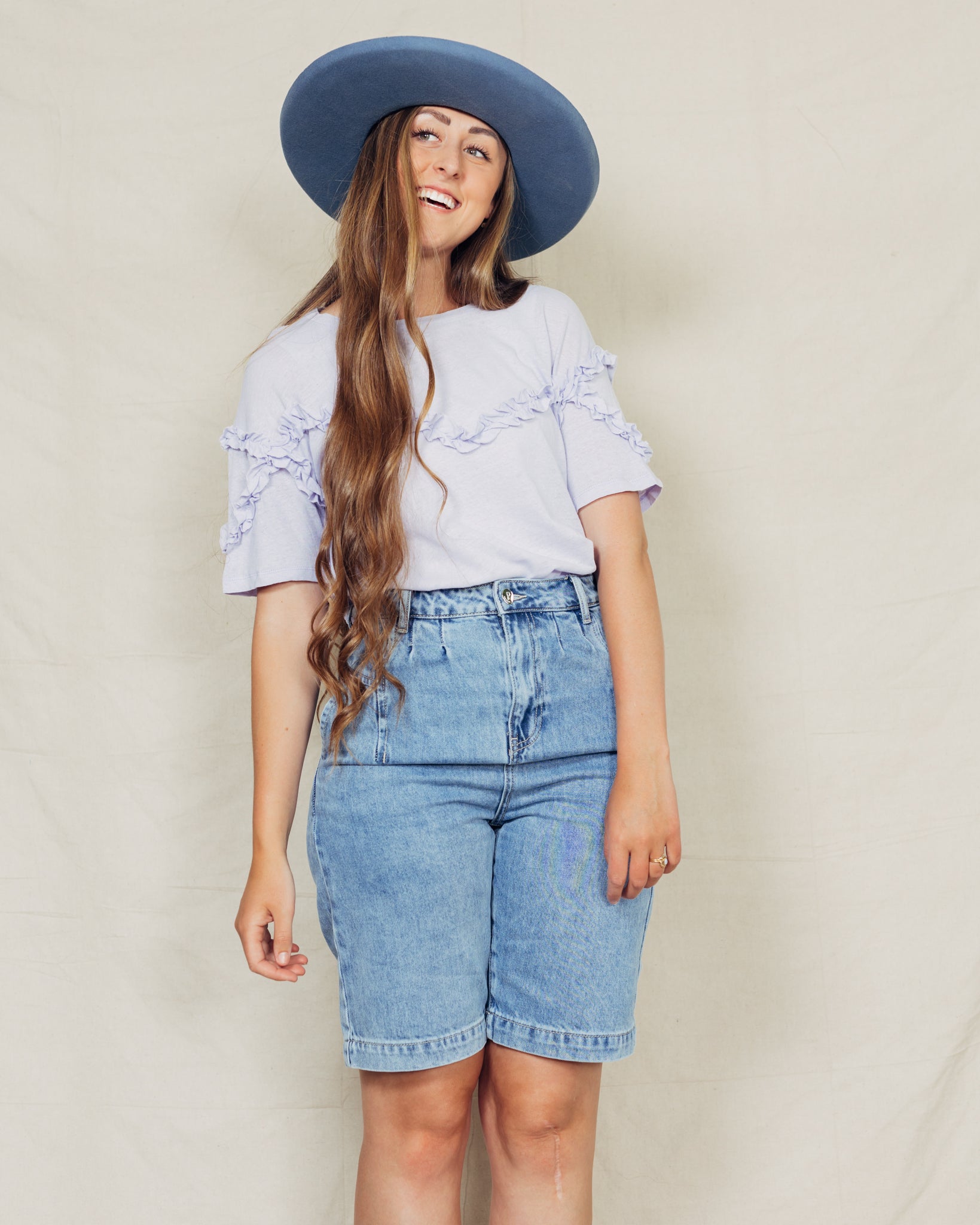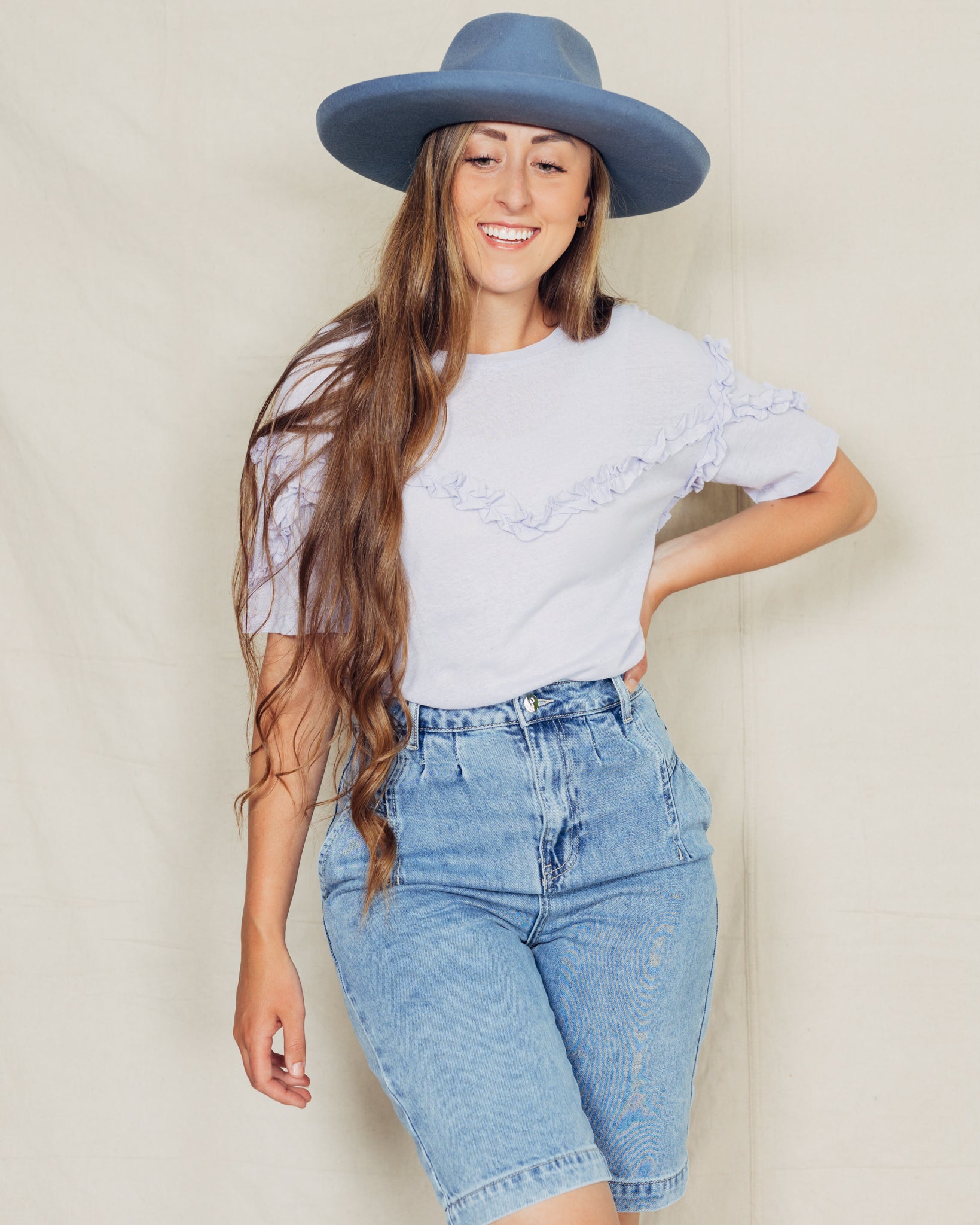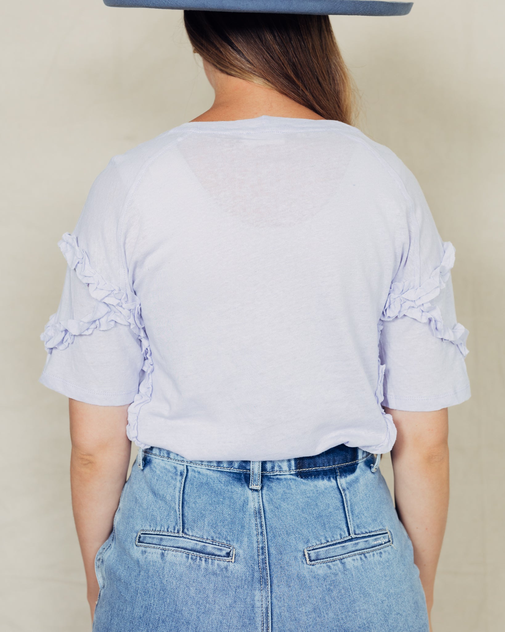 The Trae Top is a tee with a feminine flair. I am 5'9" and wearing a size small. The fabric content is 100% cotton.
