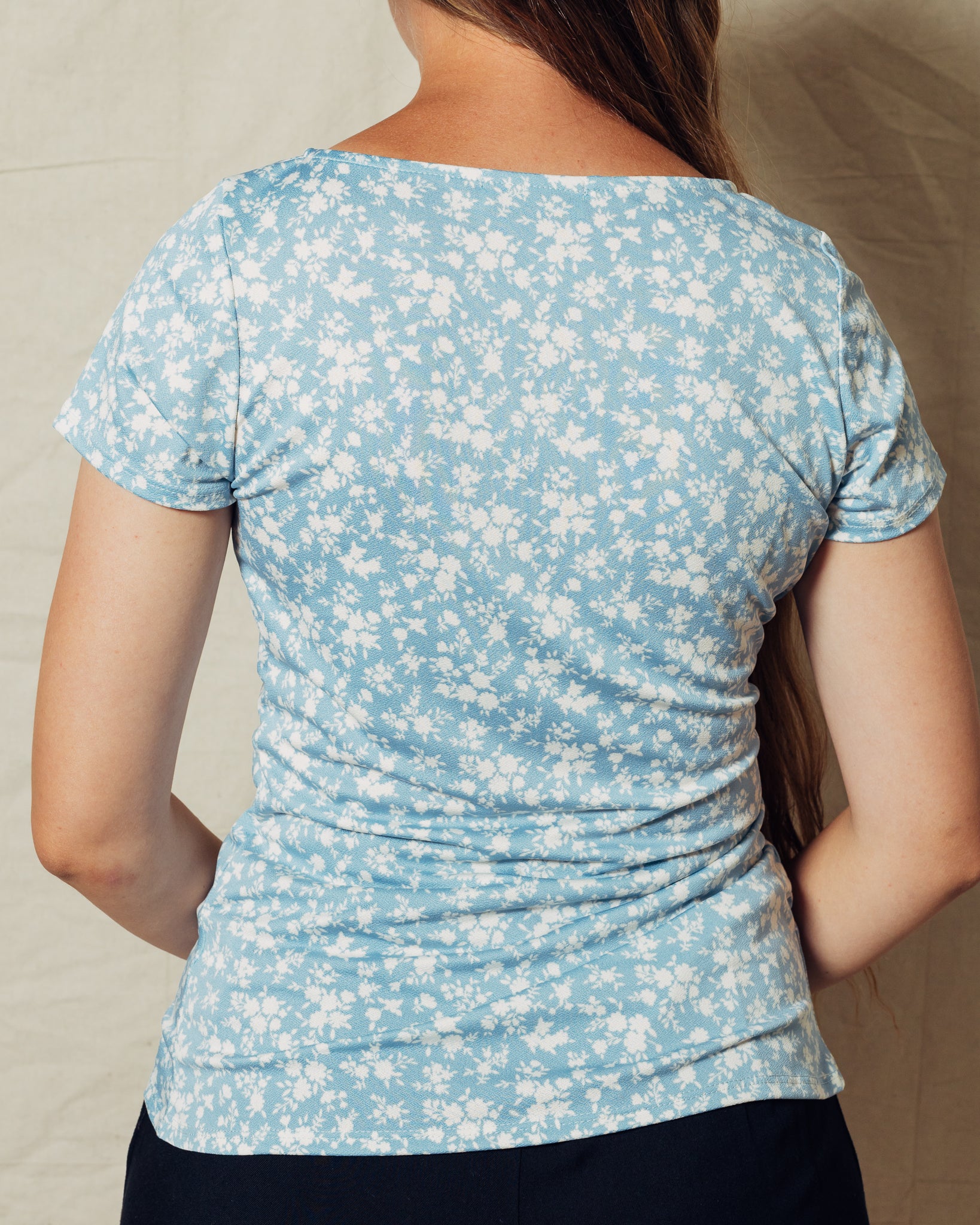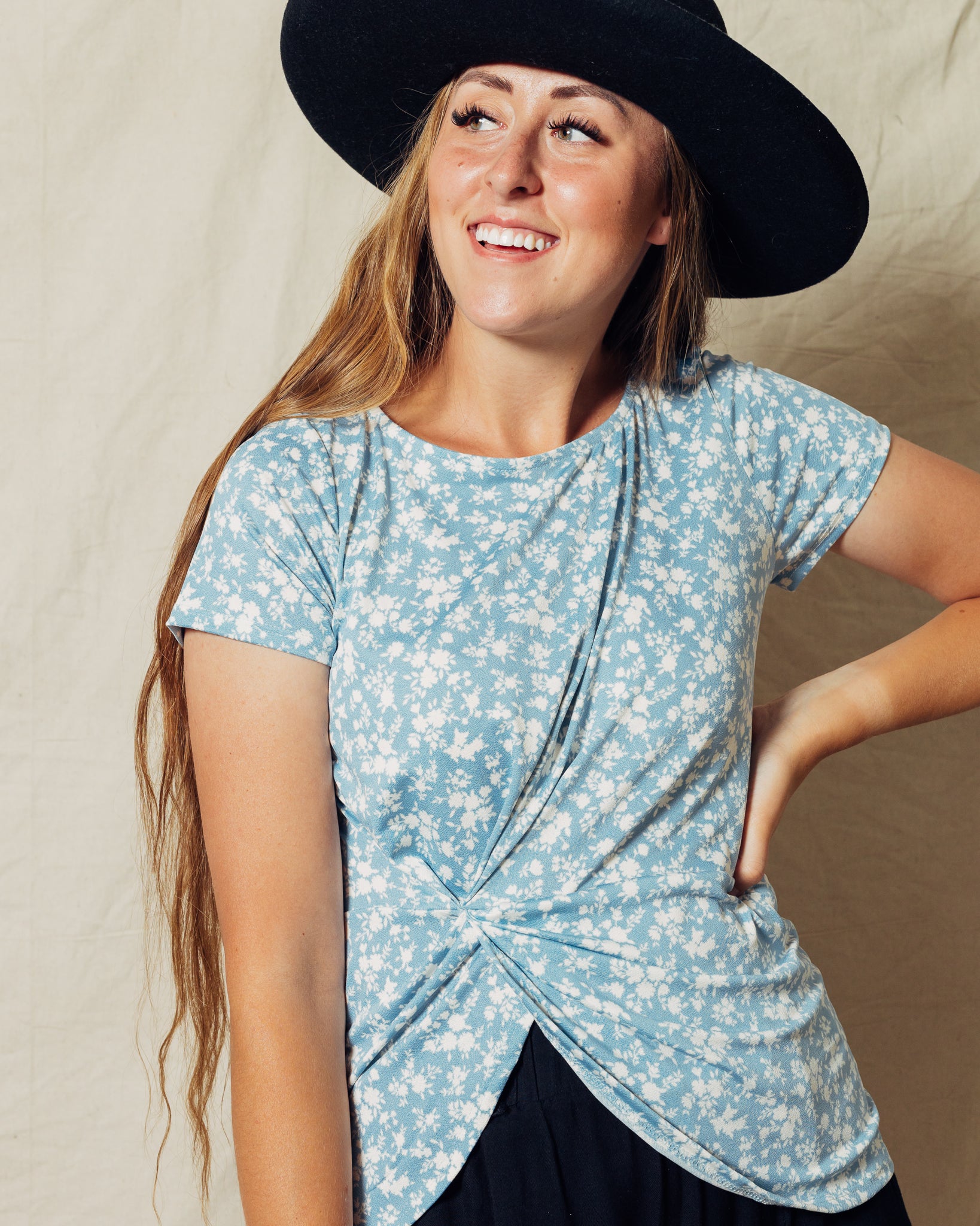 The Trisha Top is stretchy and so feminine! It is also non-sheer. I am 5'9" and wearing a size small. The fabric content is 96% polyester and 4% spandex.