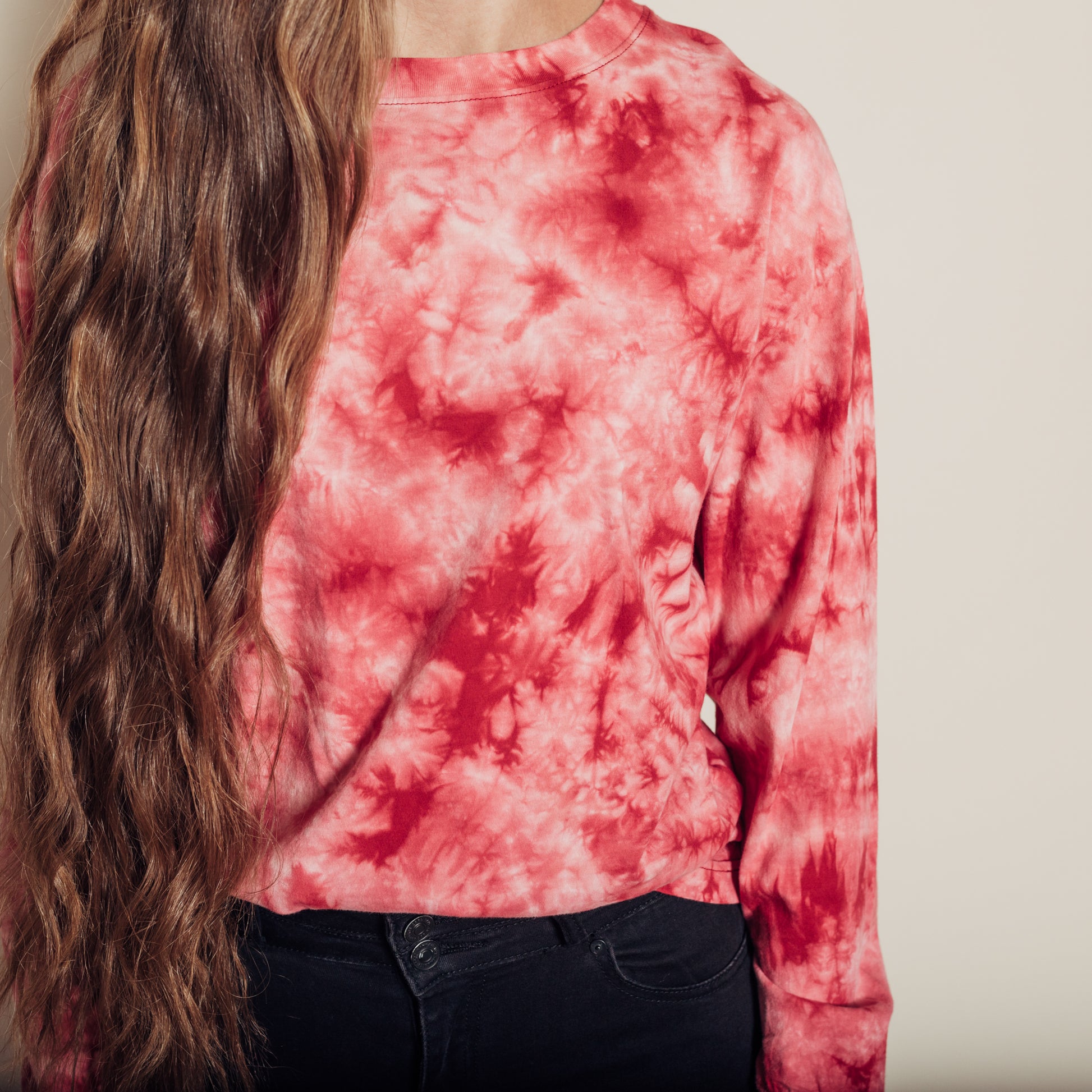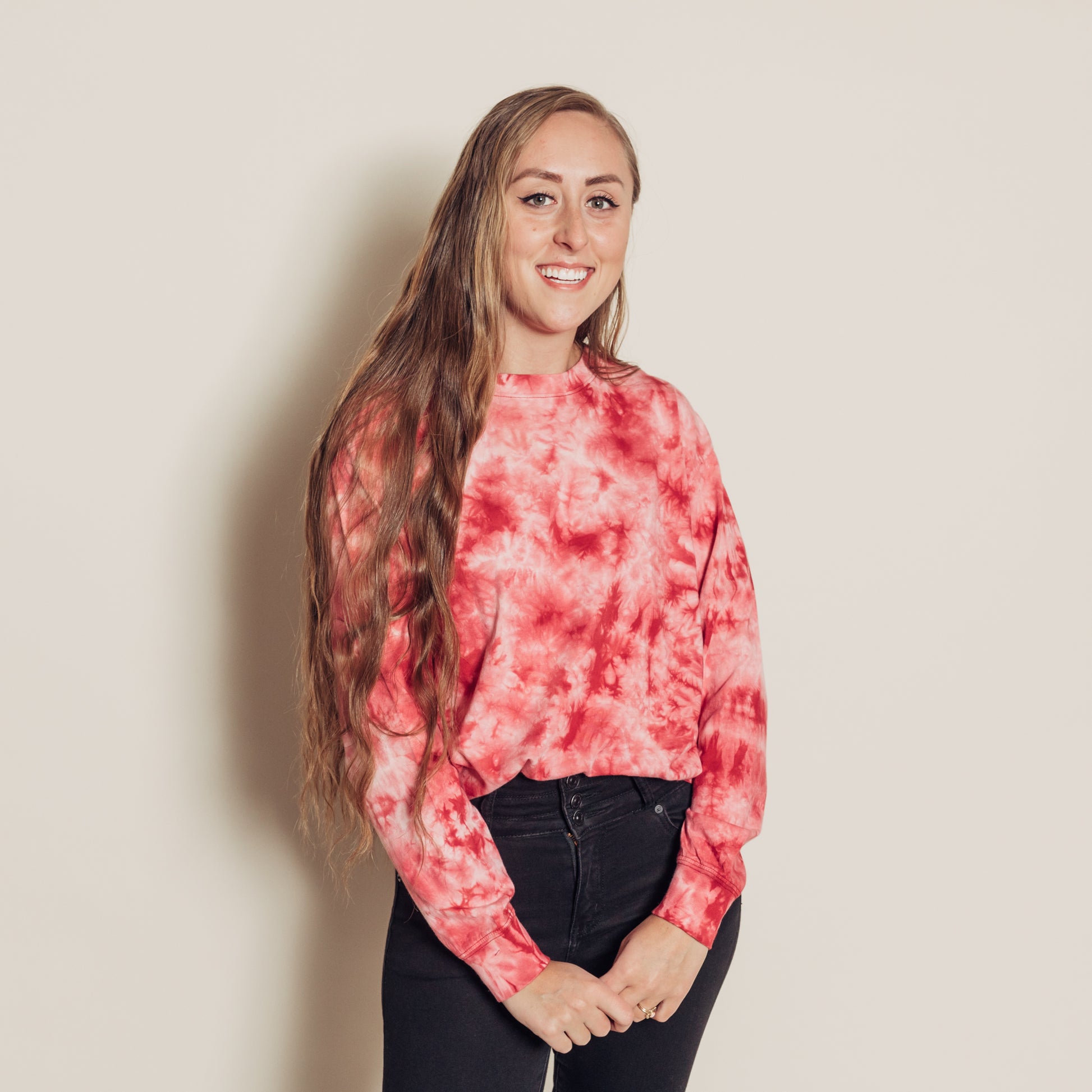 The Tyler Tee is a super soft and comfy long sleeve tie dye tee. I am 5'9" and wearing a size small. The fabric content is 100% cotton.