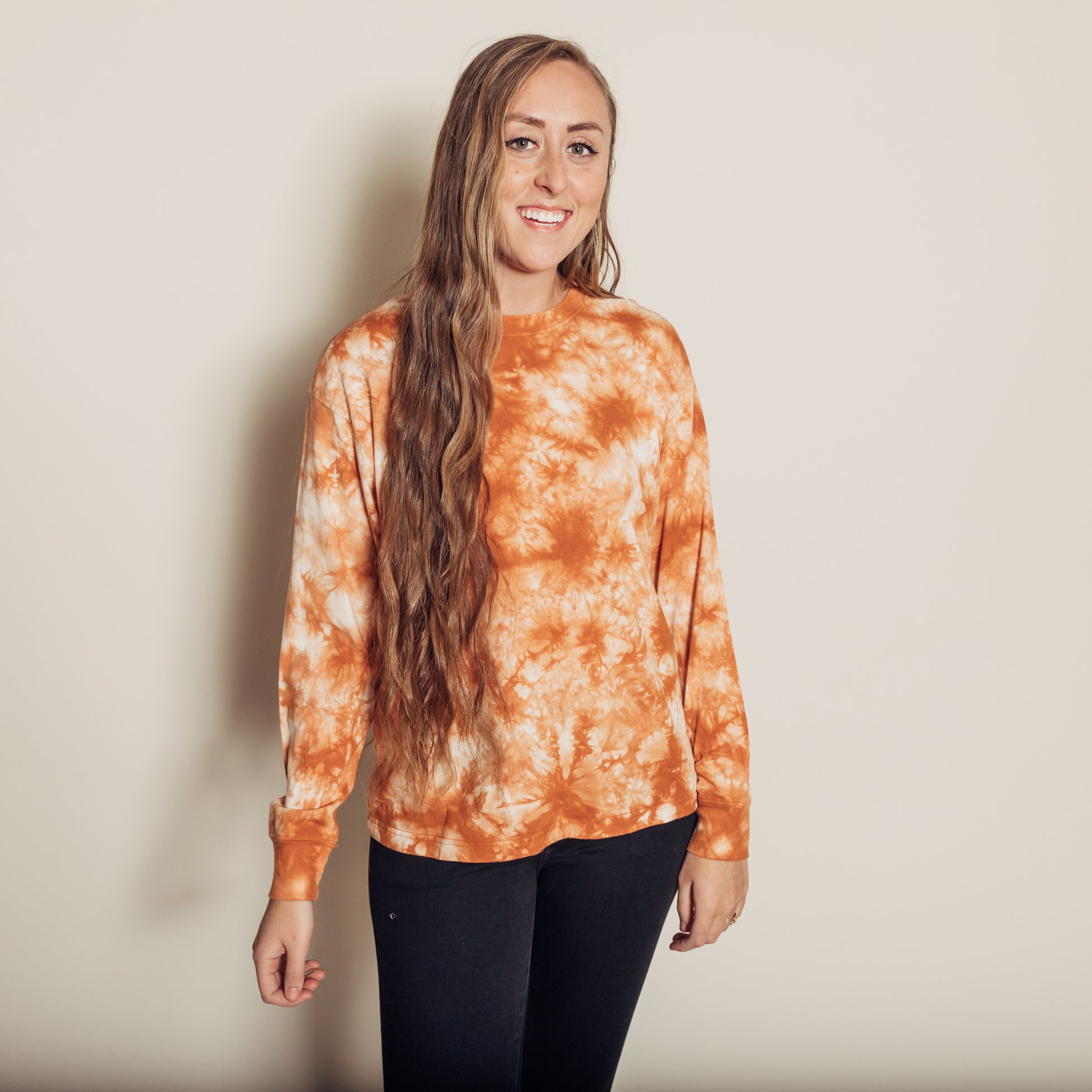 The Tyler Tee is a super soft and comfy long sleeve tie dye tee. I am 5'9" and wearing a size small. The fabric content is 100% cotton.