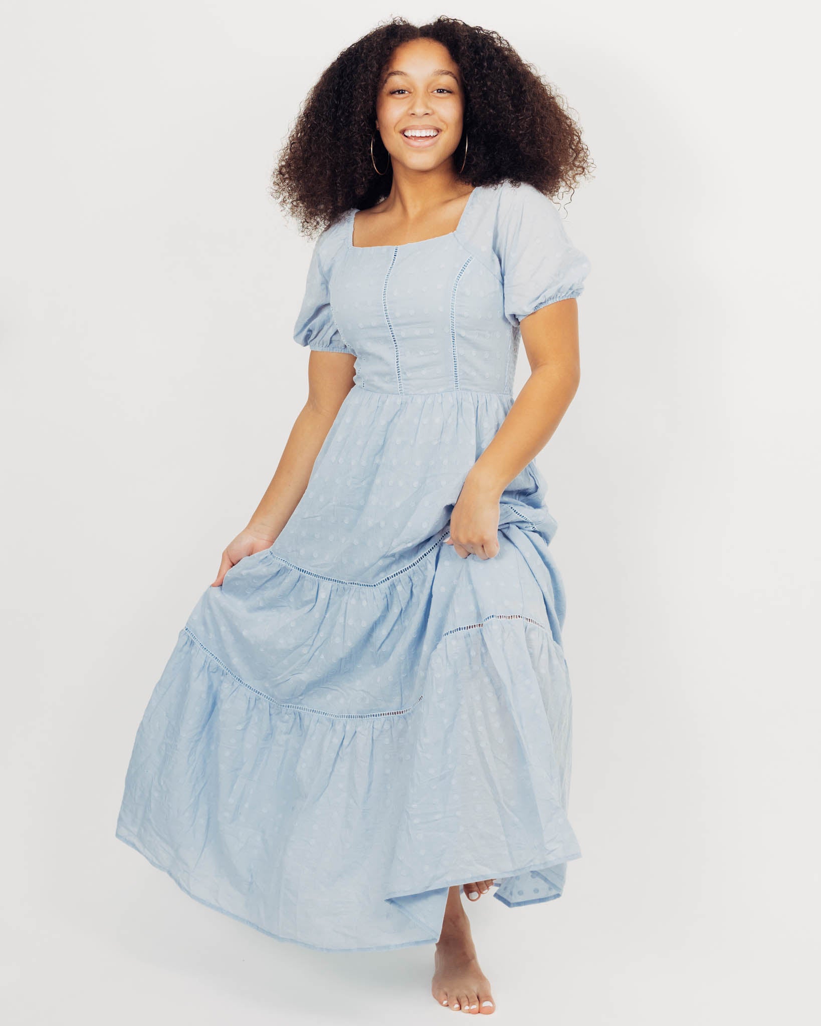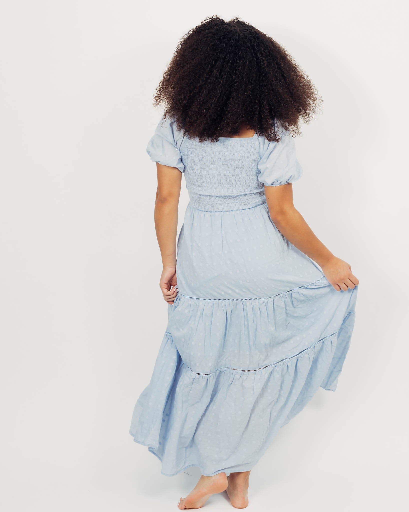 The Zena Dress is lined, so it is non-sheer. The back is smocked, so the top has a little bit of flexibilty. The model is 5'4" and wearing a size small. The fabric content is 100% cotton.